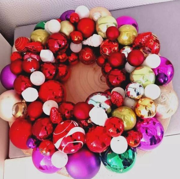 Die harmonische Kombination aus vielen bunten glänzenden Weihnachtsbaumkugeln, die zunächst auf einen mit Vlies umwickelten Strohrömer geklebt wurden und dieser dann auf einer Palauwnia-Holzplatte befestigt wurde, macht dieses Dekorationselement zu einem echten Hingucker.