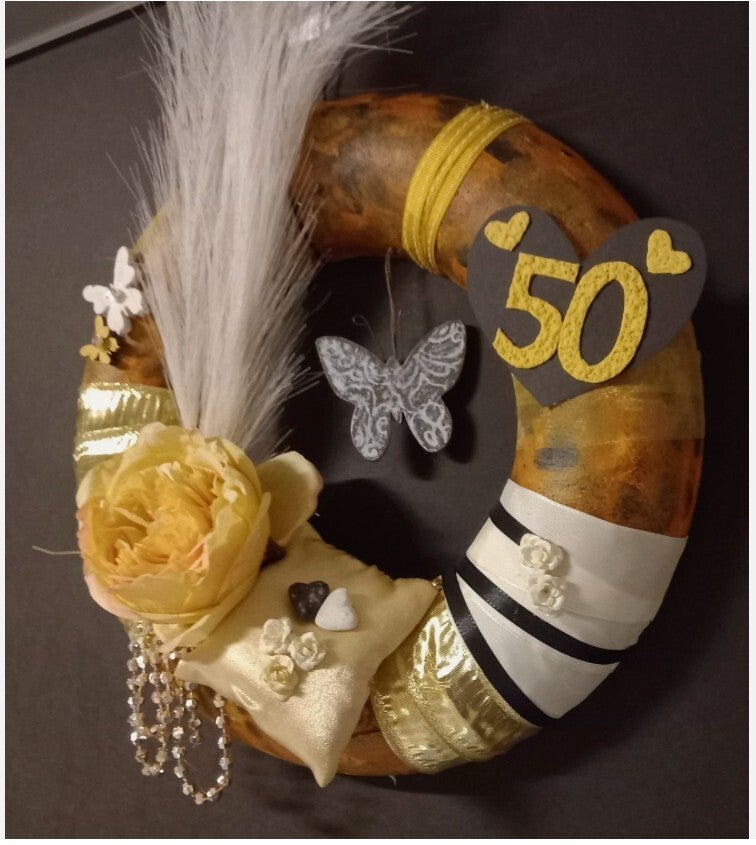 Der Kranz besticht durch sein einzigartiges Muster aus Rosen, Herzen, Schmetterlingen und der Aufschrift "50", und wird zu einem Highlight in Ihrem Zuhause.