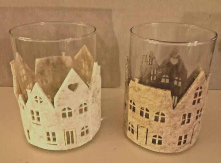 2 Teelichthalter Glas mit Filzdekoration Häuserreihe - je 9 x 13cm