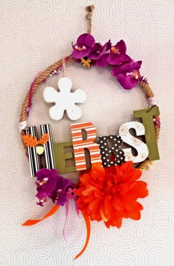 Ein 30cm großer Jutering geschmückt mit einem pinken und orange farbenen Bändern, einer Holzblume und einem Herbst-Schriftzug aus Holz.