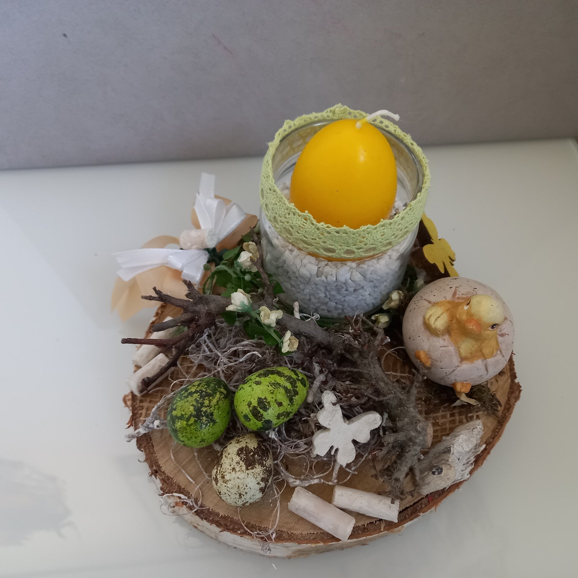 hübsches Ostergesteck auf Birkenscheibe mit Eierkerze gelb weiß natur 18cm