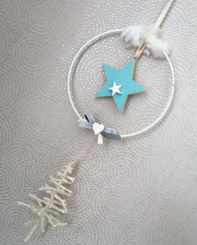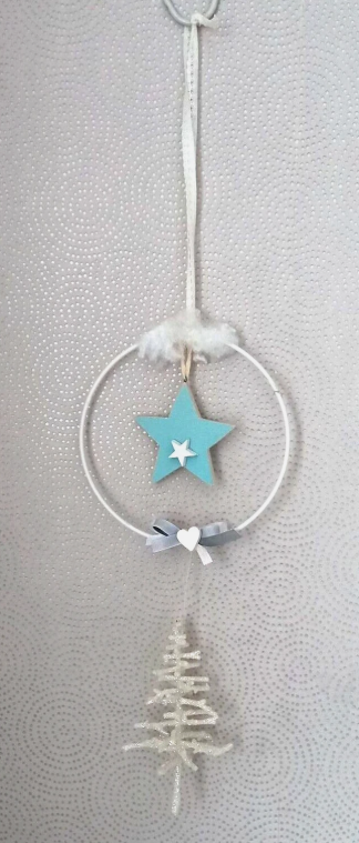 Metallring in Weiß mit einem Holzstern und einem glitzernden Tannenbaum ist eine hübsche Fensterdekoration für die Weihnachtszeit.