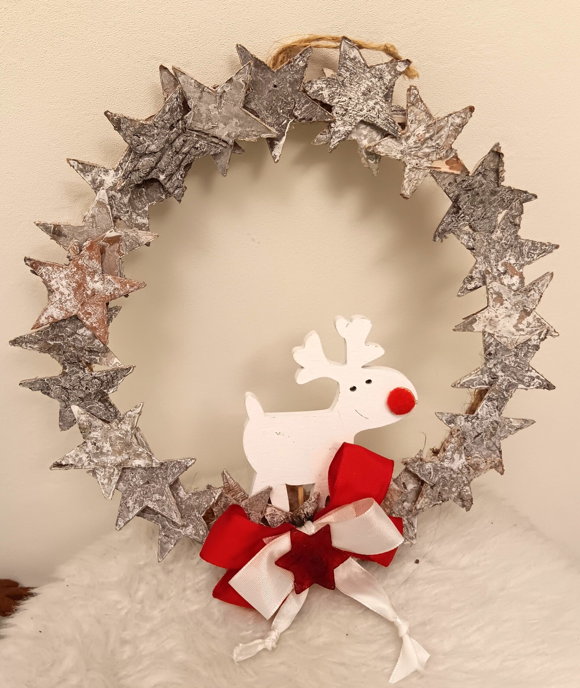 Ein Jutering verziert mit Sternen aus Birkenrinde und einem weißen Rentier aus Holz mit roter Nase
