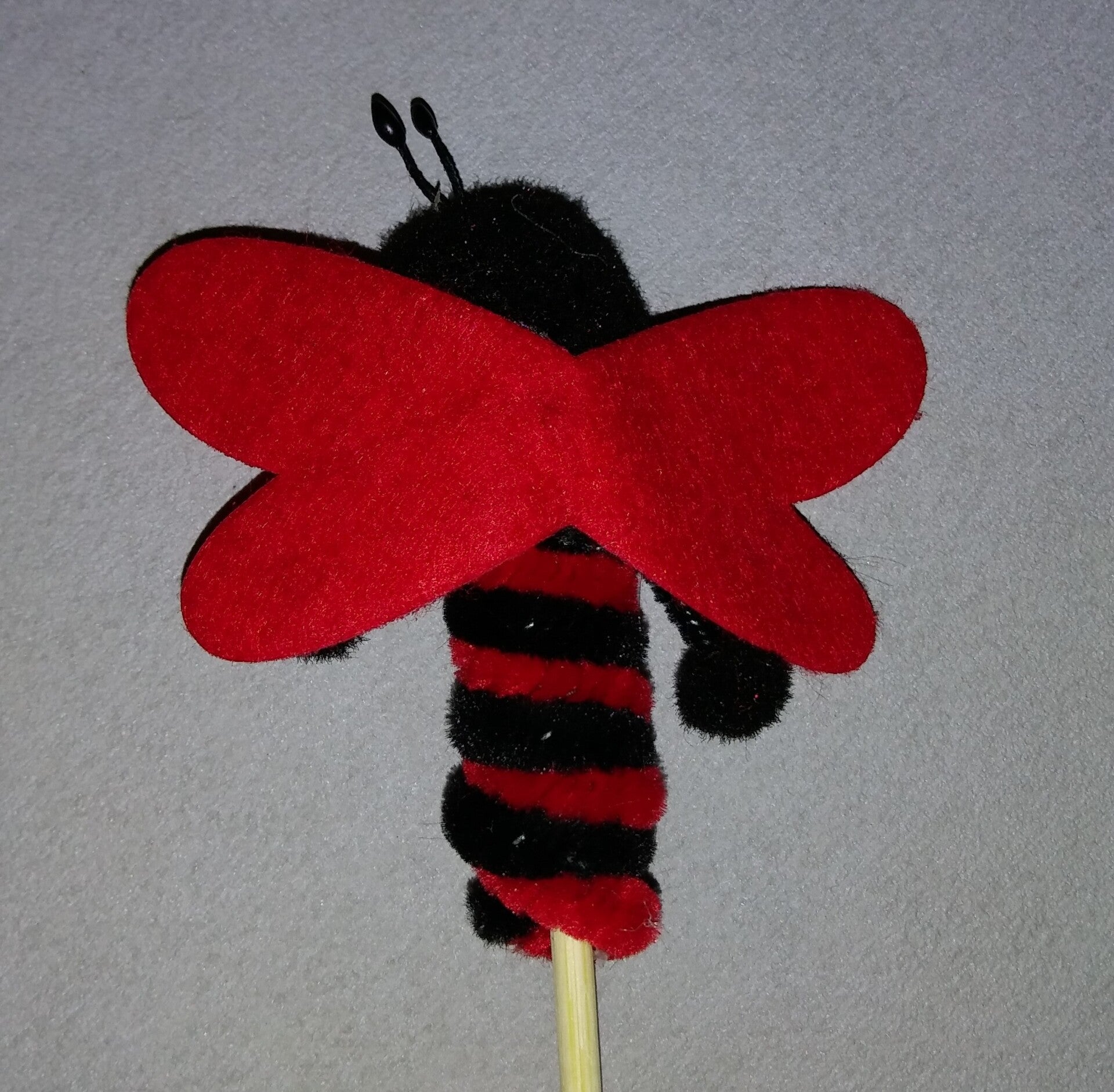 Die Marienkäfer haben eine Größe von 7,5 cm und der Stab ist insgesamt 32,5 cm lang.