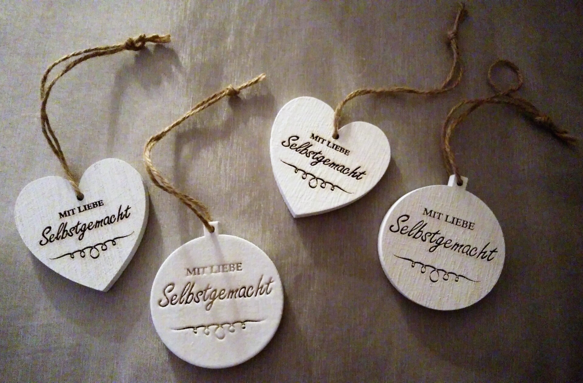 Tauchen Sie ein in die Welt des individuellen Designs mit unserem Set aus vier Holzanhängern, die mit dem inspirierenden Schriftzug "Mit Liebe Selbstgemacht" verziert sind.