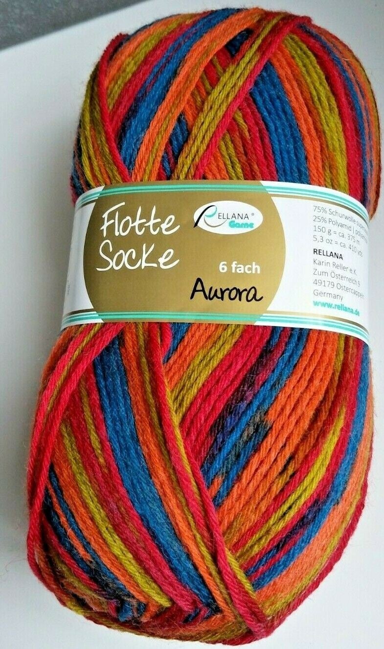 Die Rellana Flotte Socke Aurora ist eine hochwertige Sockenwolle aus 75% Schurwolle superwash und 25% Polyamid.