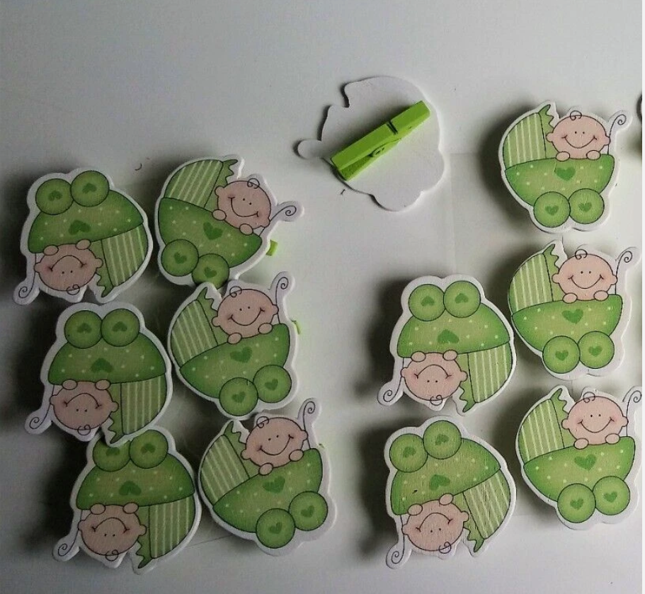 12 Holzklammern in grün 4cm Baby Deko Kinderwagen NEU Taufe Geburt Motivklammer
