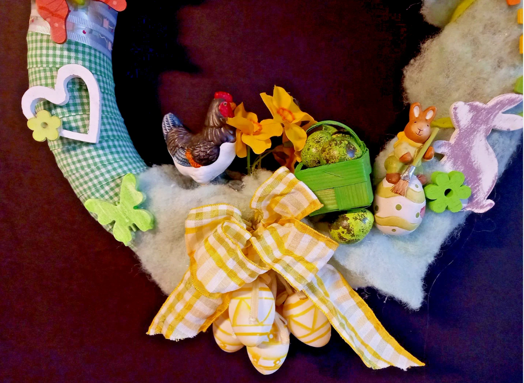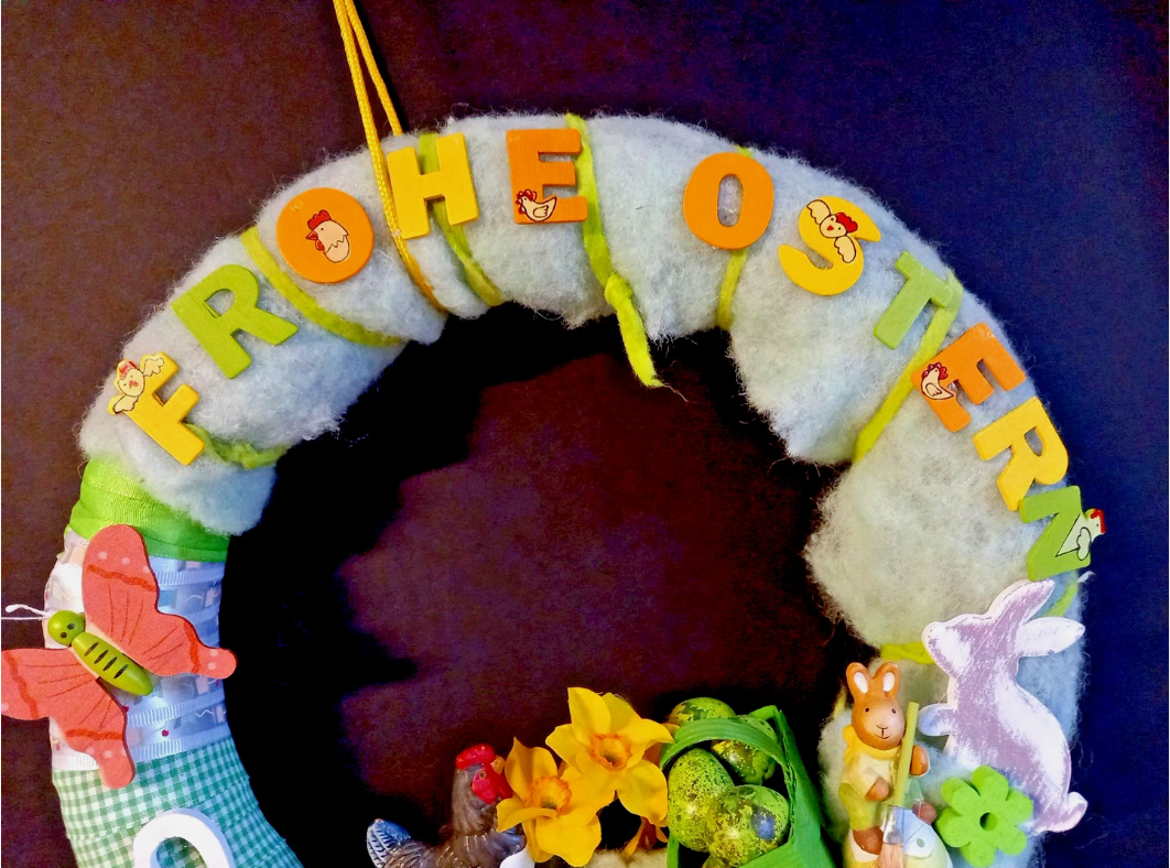 ist aus einem liebevoll zusammengestellten Materialmix aus Holz, Stoff, Heu und Kunststoff handgefertigt und das Ostern direkt zu Ihnen nach Hause. Ideal geeignet, um als Wandschmuck die festliche Stimmung zu vervollkommnen.
