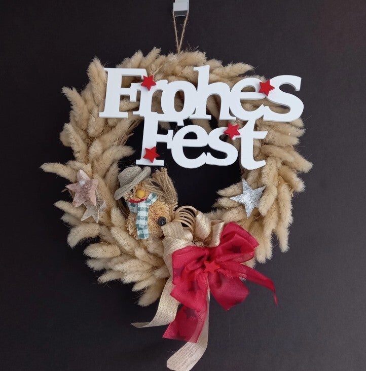 verziert mit einem Schneemann aus Stroh und einem Schriftzug in weiß " Frohes Fest" , Holzsternen und Schleifen